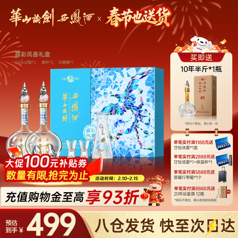 节日送礼首选!西凤华山论剑晶彩凤香礼盒白酒52度500mL 2瓶装 京东Plus专享价378.61元赠好酒