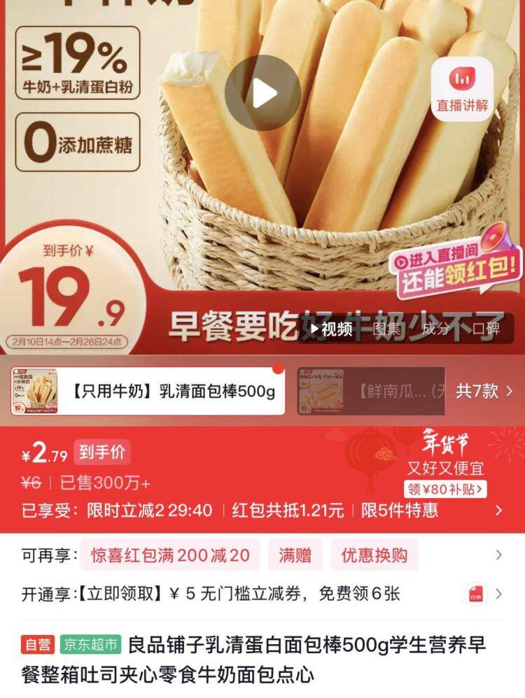 【限时特惠】良品铺子如清蛋白面包棒500g仅22元!立减5元抢购中