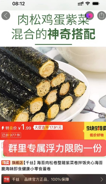 秒杀1.9元包邮,千丝海苔肉松卷