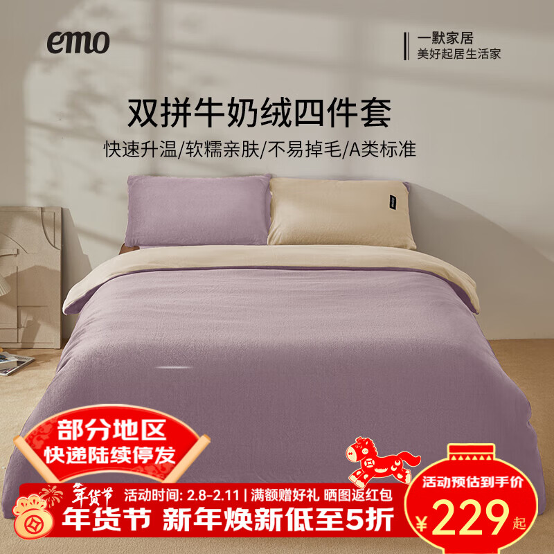 ¥267 一默牛奶绒四件套冬季床单被套枕套保暖亲肤宿舍床上用品双拼色多件套 双拼-紫汀柔光 床单款 (被套200*230cm) 309