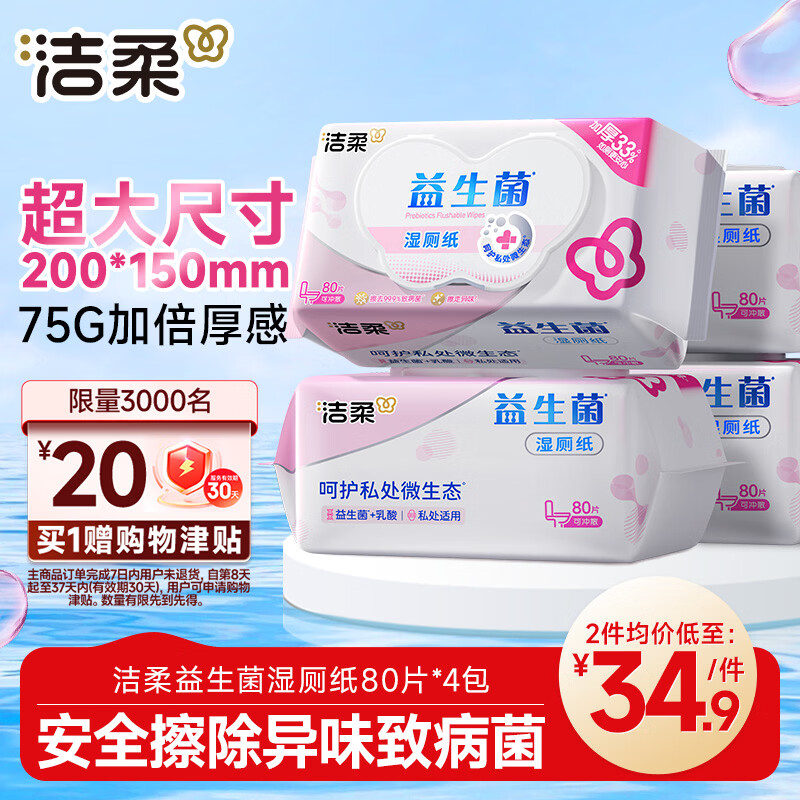 洁柔益生菌湿厕纸80抽*5卷仅32元!赠20元购物津贴超值抢