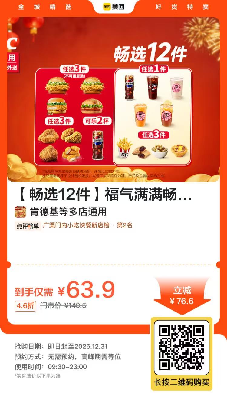 全国多店可兑✔️也可外荬到家,0元送到家‼️有主食3件+炸鸡小食任选6件+饮品任选3件!