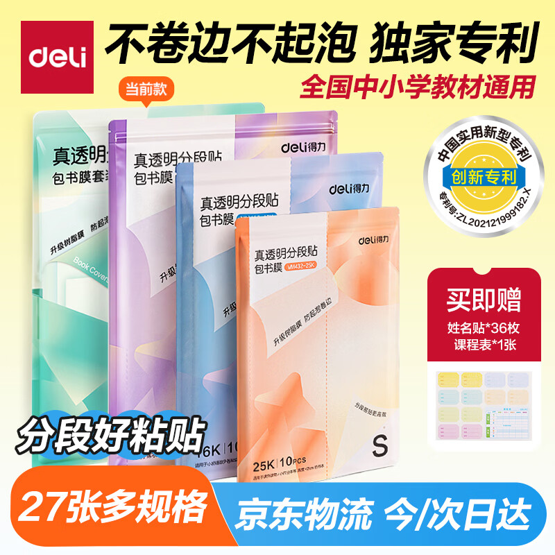 得力(deli)分段式 10张中号/16K 分段贴包书膜 分段易撕易贴 防水防脏 学生包书皮/包书膜 VM403S