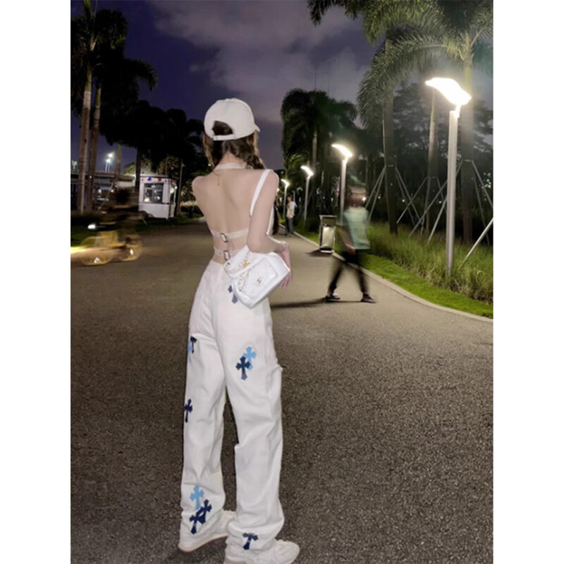 ¥76 POUM白色破洞直筒轻奢牛仔裤男秋季新款十字皮标宽松显瘦阔腿裤子男 CHFS-C991白色 破洞款 L 115-130斤 78