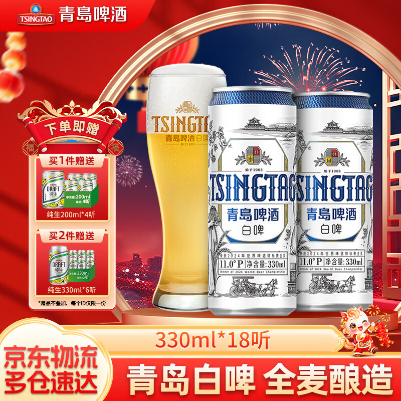 ¥84 青岛啤酒全麦白啤 原麦汁浓度11°P 330mL 18罐 青岛啤酒 104