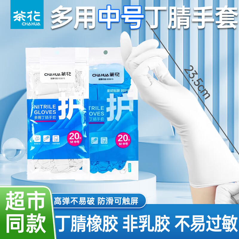 ¥13.8 茶花(CHAHUA)丁腈手套橡胶家务手套厨房洗碗洗衣清洁胶手套劳保防水胶皮手套 【普通款-随机色】中号 40只装 无粉末无乳胶,左右手通用 17.8