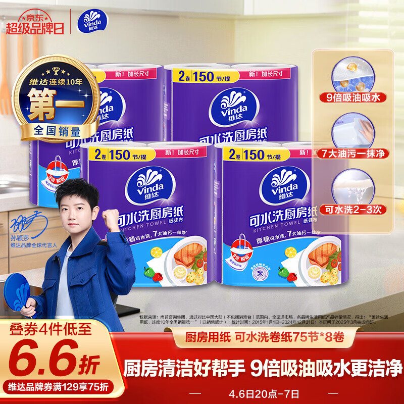 维达可水洗厨房卷纸75节*8卷 最终到手价83.52元