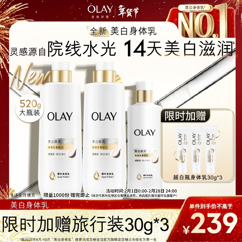 OLAY烟酰胺美白身体乳520g*2+260g套装,到手价219元限时抢!