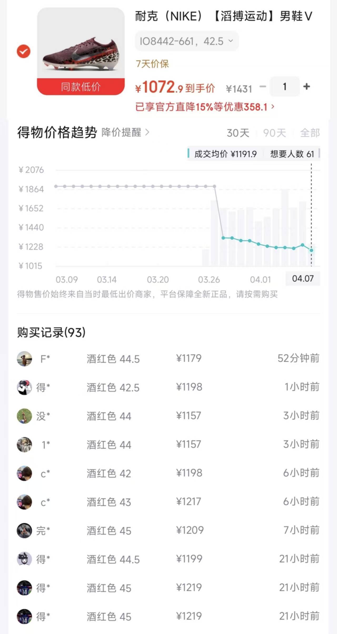 耐克Vapor足球鞋到手价1072元(叠加券992元)
