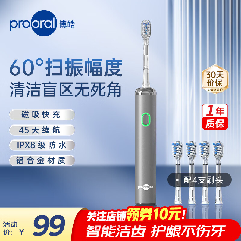 ¥190 博皓(prooral)电动牙刷新一代扫振智能成人牙刷深度清洁牙齿 3档模式净齿护龈 送学生情侣款生日礼物 LS-1 流光银(标配4支刷头) 200