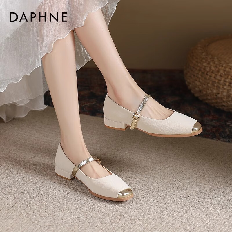 ¥99.9 达芙妮玛丽珍女鞋2024新款春秋法式气质优雅小香风皮鞋拼色一字扣单鞋JL 米金色 39 249.9