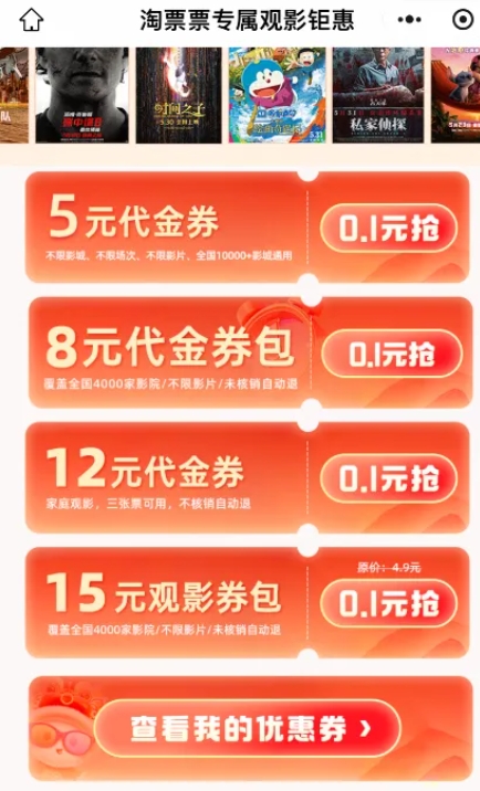 0.1元入多个额度的影票代金卷,不用的话自动退掉
