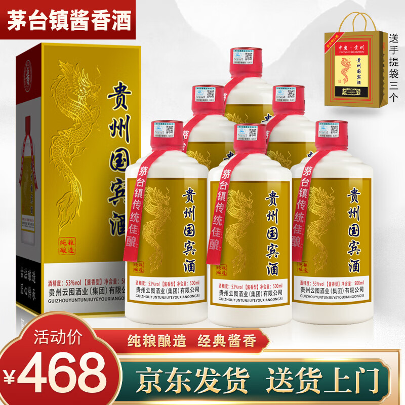 ¥468 鲲九潭贵州茅台镇 酱香型白酒整箱 53度高粱酒 纯粮食酿酒 高度老酒礼盒 53度 500mL 6瓶 国宾酒 整箱装 518