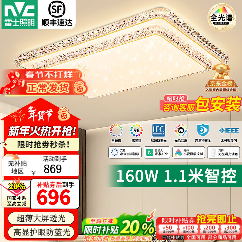 ¥819 雷士(NVC)智能全光谱护眼防蓝光led吸顶灯大客厅卧室餐厅灯具2026新款主灯 160W 30㎡内适用 7899lm 智能-碧月 869