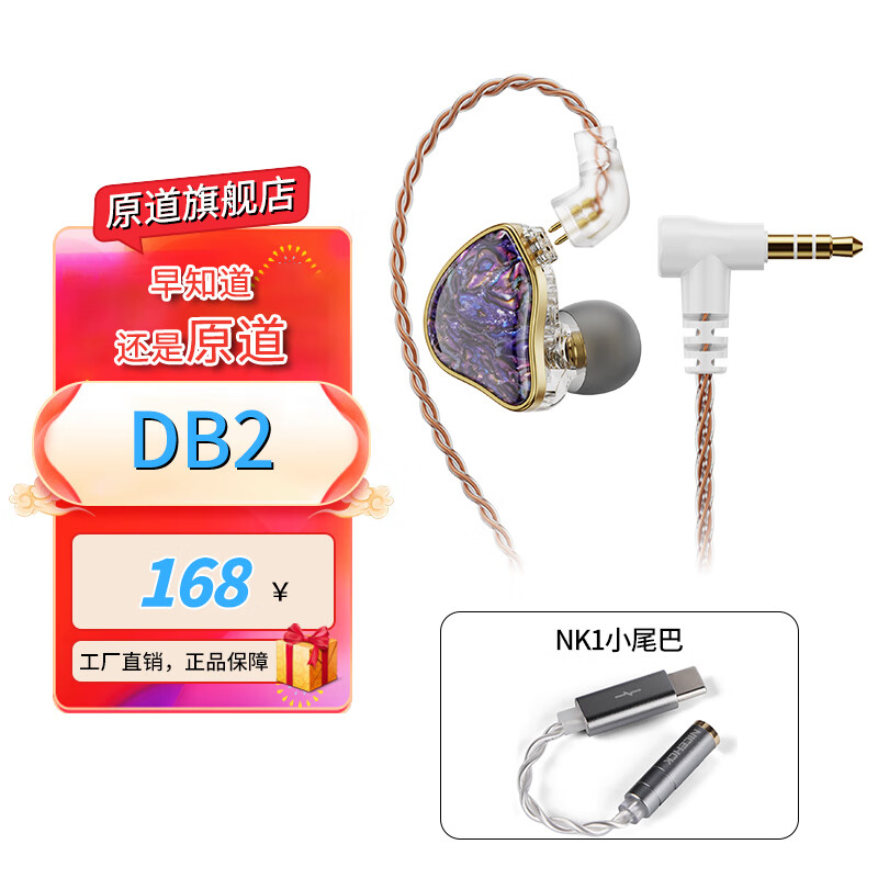 ¥158 原道-DB2 百元圈铁入门新声入耳式HiFi有线耳机0.78可换线三频均衡安卓手机带麦线控K歌游戏高音质耳塞 【DB2】-星夜紫无麦+NK1小尾巴 168