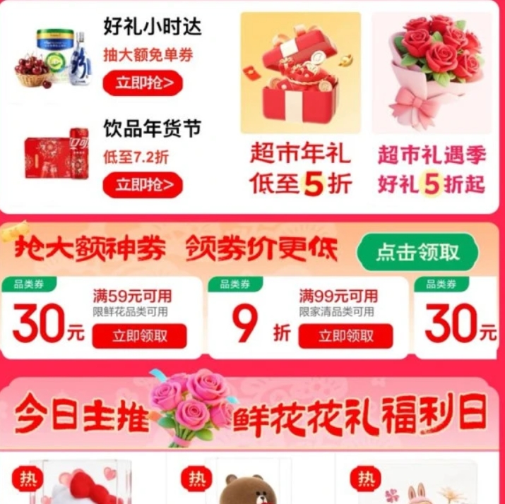 京东超市 年货节会场 领满99元打9折/169元打85折/59-30/199-100元品类优惠券等