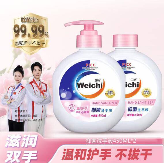卫驰抑菌洗手液450g*2瓶+1头,到手价仅需4.99元