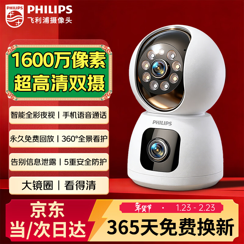 ¥159 飞利浦(PHILIPS)摄像头家用监控器360度无死角带夜视全景监控无需连wifi终身免流量手机远程可对话室内高清监视器 WiFi版双摄+7天循环录像+终身免费回放 169