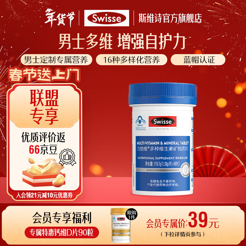 【限时抢购】斯维诗男士复合维生素90片86元!女士款96元,蓝帽认证健康礼