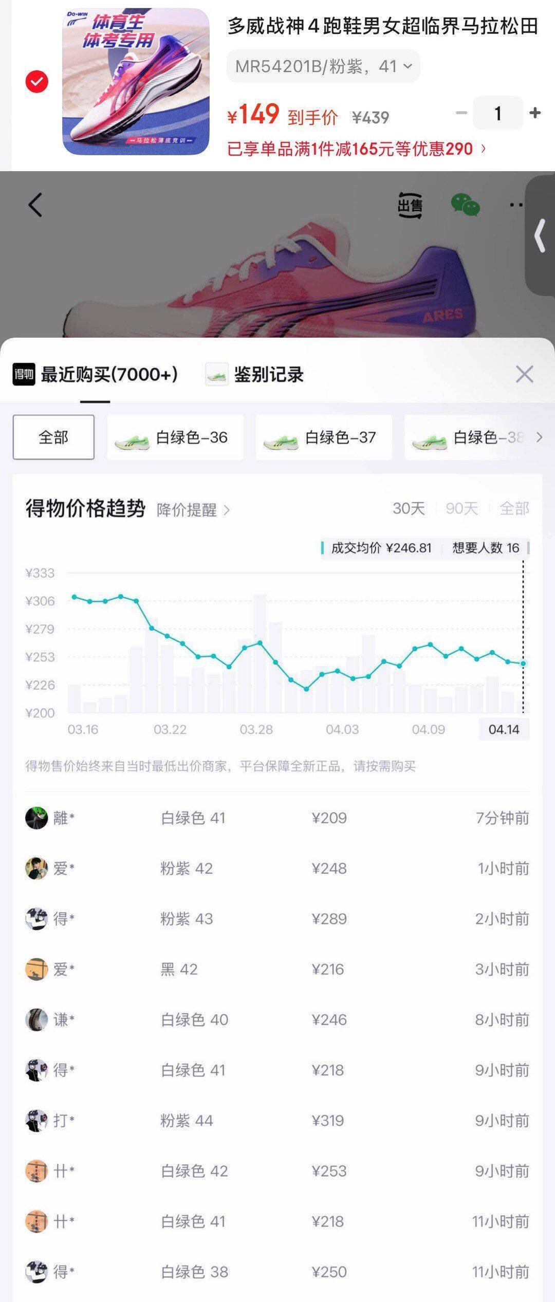 多威战神4跑鞋到手149元,得物售价248元