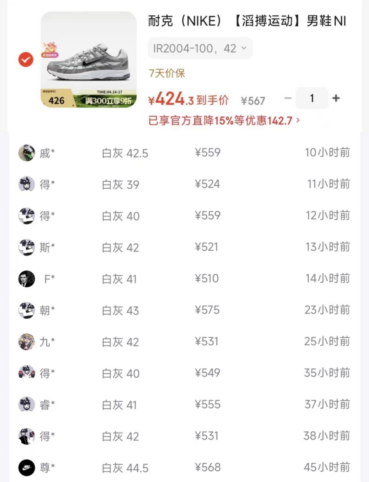 耐克P-6000白灰 到手价424元