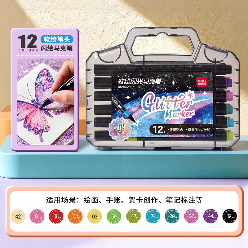 12元抢购!得力闪光马克笔12色套装,学生儿童美术创意必备闪亮文具