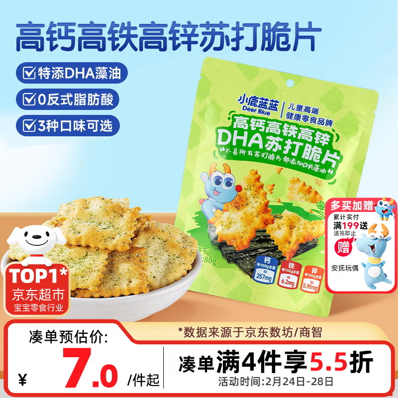宝宝零食狂欢!小鹿蓝蓝高钙高铁高锌DHA苏打脆片80g海苔味仅0.95元到手