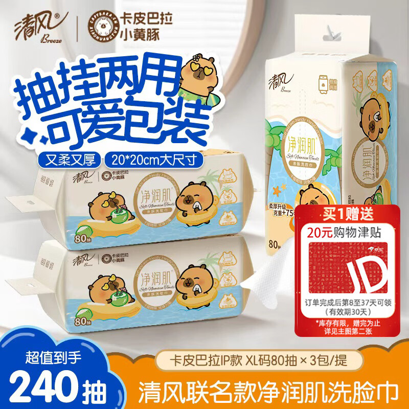 清风卡皮巴拉联名洗脸巾80抽*3包 最终到手价4.51元