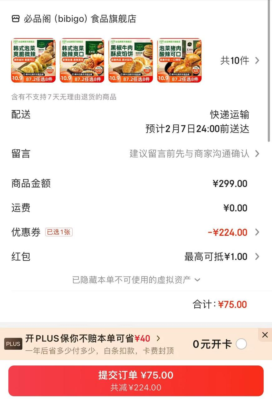 必品阁饺子75元任选10袋,每袋仅7.5元速抢!