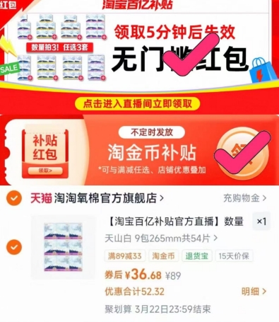 在售价89元,领33元券,部分号商品页弹5元限时红包,商品页价格下拉详情 领8元红包(跳转直播间加购1件),再商品页价格下拉详情页淘金币补贴点进去加购1件,最后购物车修改数量1件,叠淘金币,实付低至36.68元包邮,最多9包‼️