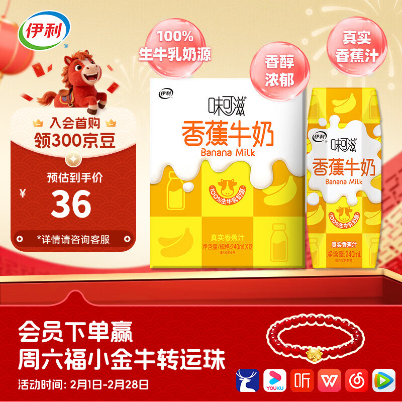 【年货直降】伊利香蕉牛奶240ml×12盒装到手价仅29元!营养早餐必备礼盒