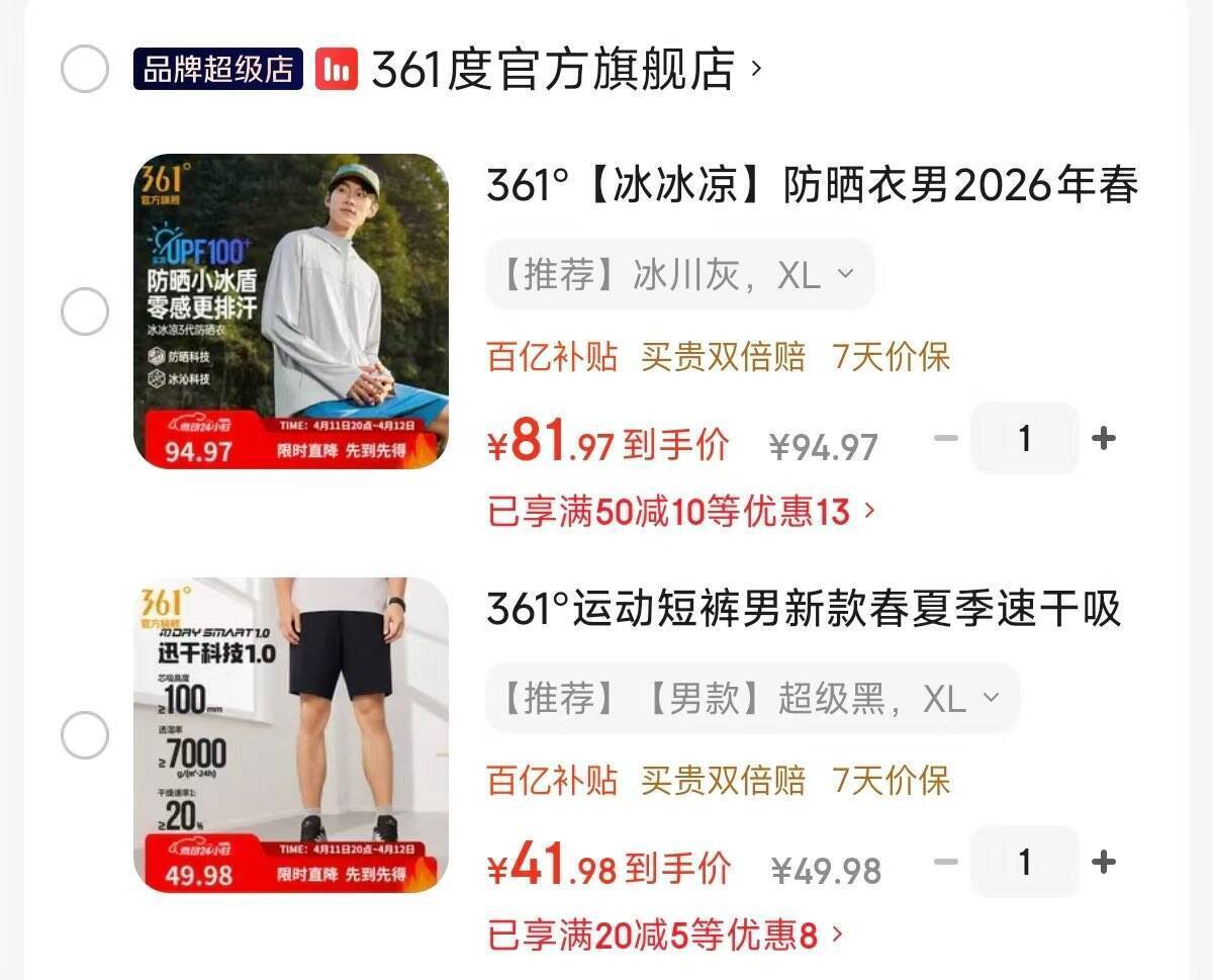 361度防晒衣+速干五分裤组合,到手价仅需41.98元起