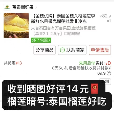 泰国金枕巴掌榴莲2-2.5斤,最终到手55.9元