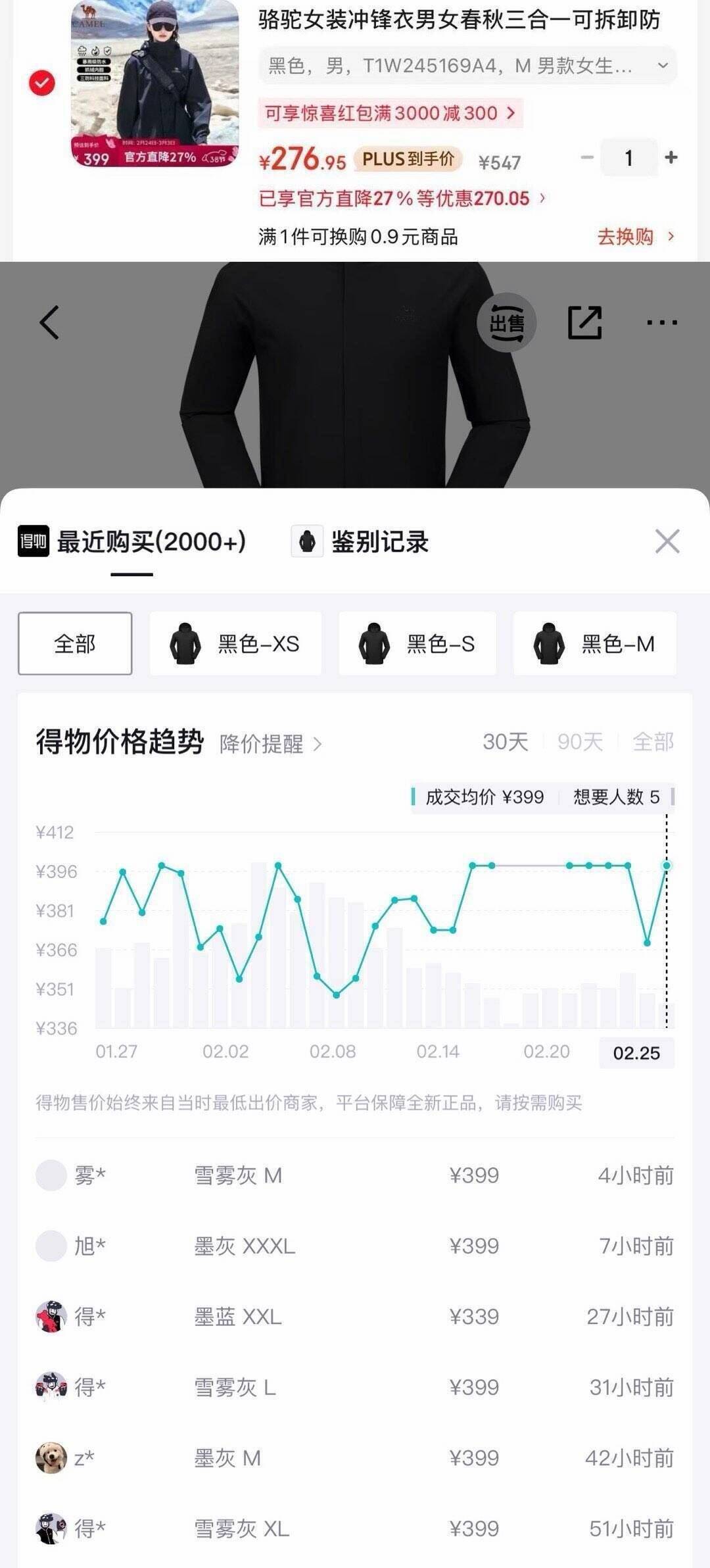 骆驼冲锋衣限时特惠!黑色M/XL码263元抢,其他色279元,原价399元立省136元
