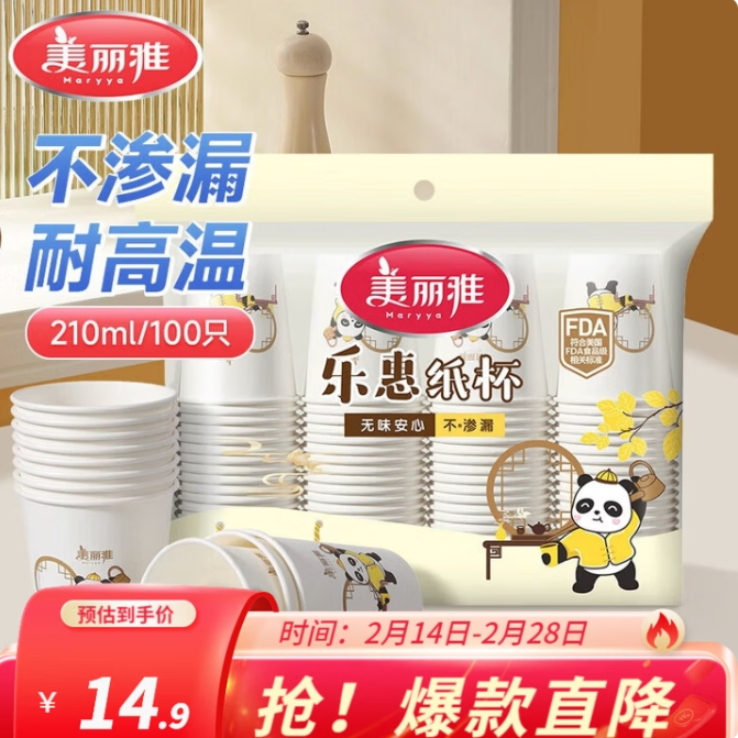 6.99元包邮!美丽雅 乐惠 一次性加厚纸杯 210ml*100只