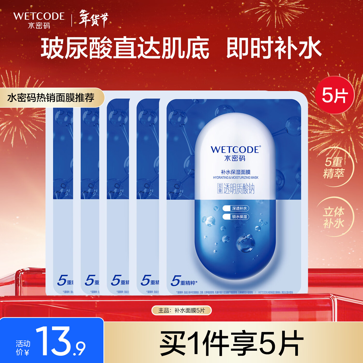 水密码玻尿酸补水面膜5片装,深层滋润保湿,男女通用!