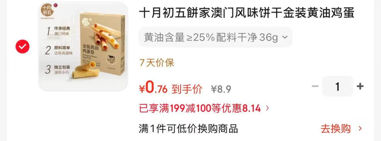 十月初五饼家金装黄油鸡蛋卷36g,最终到手价0.7元