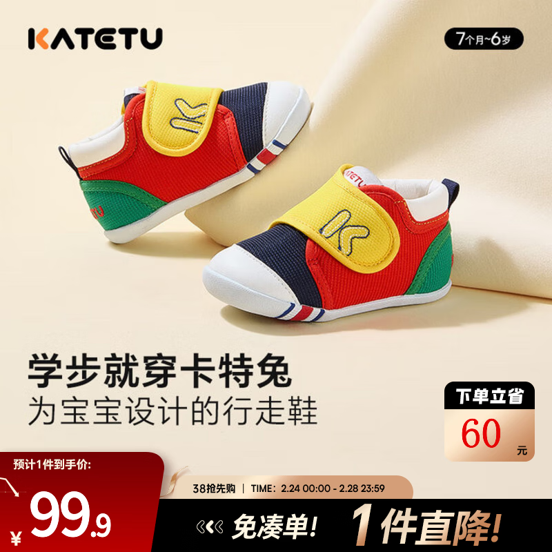 ¥129.9 卡特兔宝宝学步鞋春季童鞋儿童鞋软底婴儿鞋男童女童室内机能鞋 黄红蓝-棉纱 17 内长11.0cm 脚长10.0-10.5 159.9