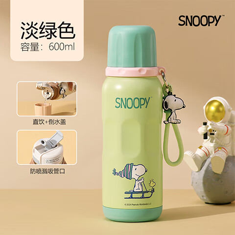 ¥39 史努比保温杯儿童316不锈钢男女学生上学专用大容量耐摔便携吸管水杯子 绿色【一杯三饮+316内胆】600ml 49