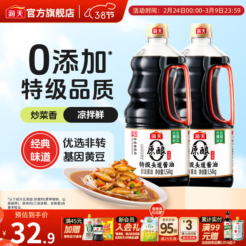 海天零添加特级头道生抽2瓶装26.9元包邮!炒菜凉拌鲜香必备