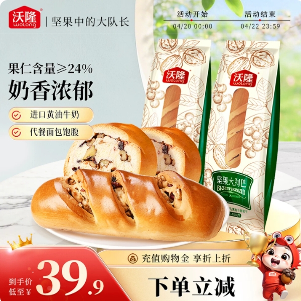 19.5元包邮!沃隆 坚果大列巴全麦坚果面包 400g*2袋