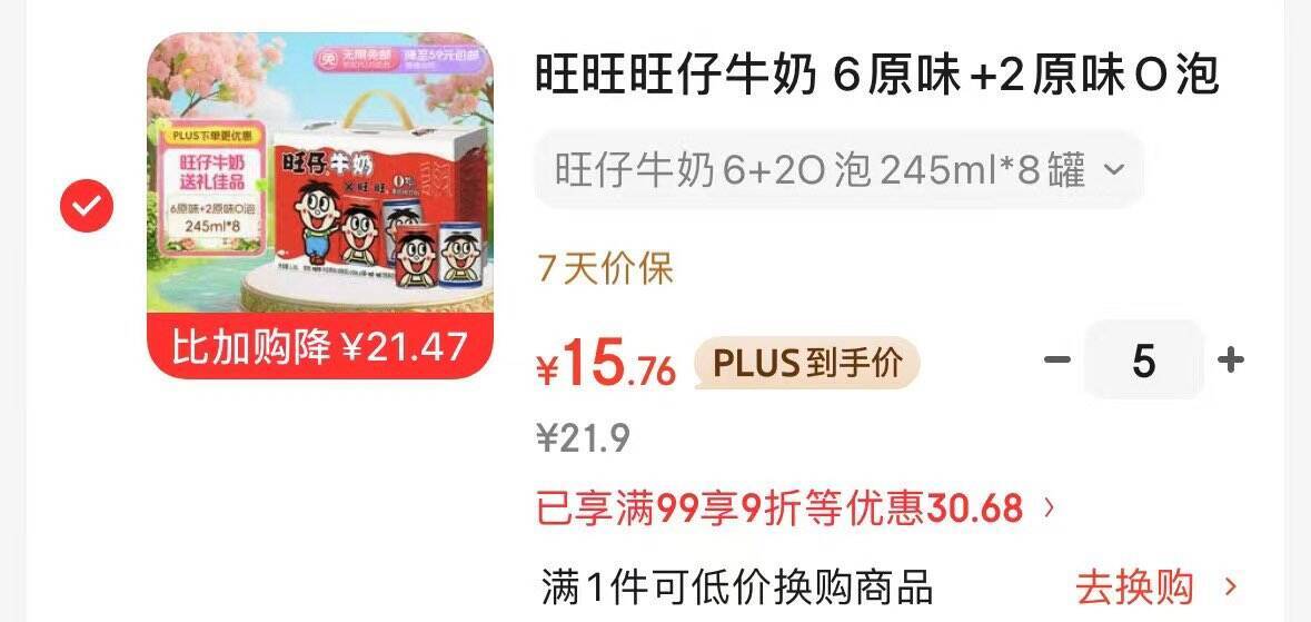旺仔牛奶组合装(6原味+2O泡)8罐仅需5元