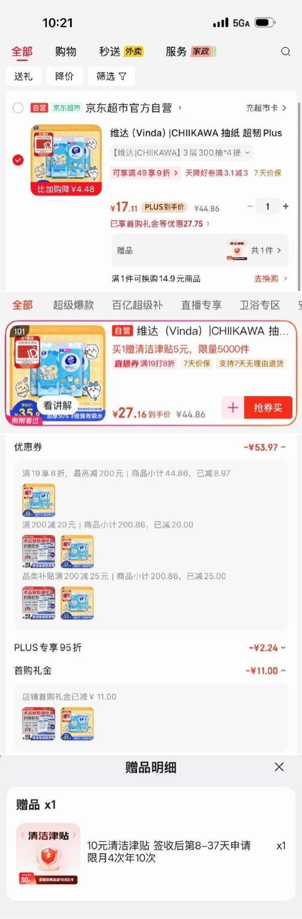 维达超韧Plus挂抽3层300抽*4提,叠加黑五券首单津贴到手仅7.11元