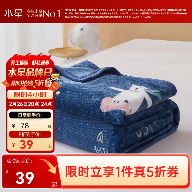 水星家纺春季特惠:39元抢母婴法兰绒毯+79元四季被,限时折扣!