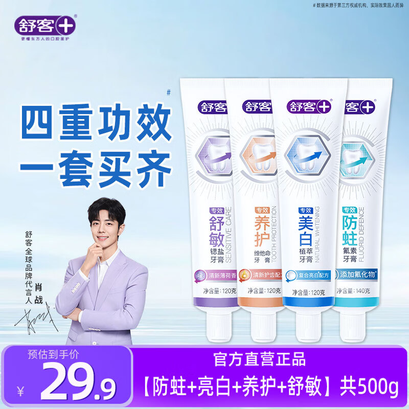 ¥19.9 舒客牙膏专效庭装防蛀洁白牙齿减少牙菌斑舒敏清新口气 超值囤货装4支共500g 29.9