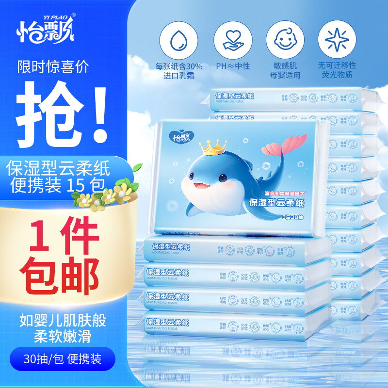 ¥9.9 怡飘(yipiao)云柔巾母婴幼柔纸巾乳霜抽纸 3层 30抽*15包 29.9
