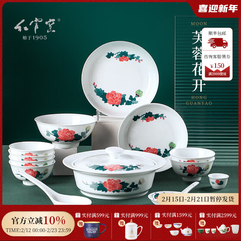 ¥118 红官窑芙蓉花开餐具套装醴陵陶瓷碗餐盘菜碟釉下彩瓷器高档过节乔迁礼品 7英寸菜盘1个 128