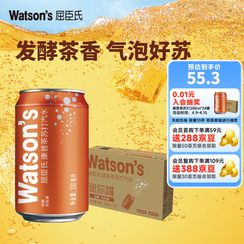 屈臣氏康普茶苏打汽水200ml*24罐到手价45.3元