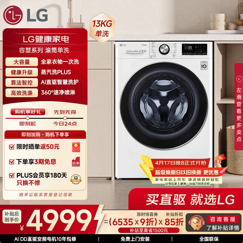LG容慧13KG大容量全自动滚筒洗衣机到手价4049.1元