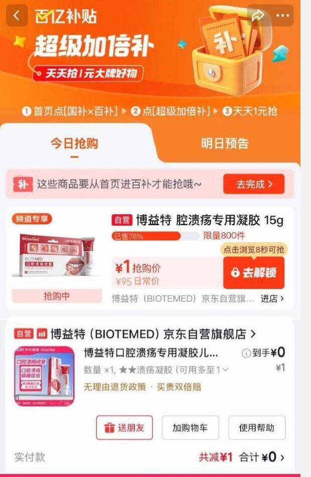 博益特口腔溃疡凝胶首单 0 元抢!百亿补贴超级加倍补